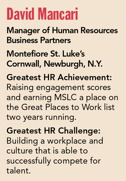 After four-and-a-half years at Target as an HR manager, Mancari joined Montefiore St. Luke’s Cornwall as an HR coordinator in 2015. Within a year, he was promoted to employee and labor relations specialist and then, in 2017, manager of human resources business partners for the 1,500-employee nonprofit hospital, whose workforce is 75% unionized.
