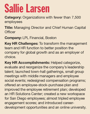 Since that scenario unfolded three years ago, Larsen has helped transform LPL into a smarter, simpler and more personal company by focusing on three strategic imperatives for the human capital function — attracting, developing and retaining talent; accelerating the company’s leadership agenda; and enhancing the performance culture. By all accounts, she’s had a dramatic impact on employee engagement and overall business performance, a key factor in her being named a 2015 HR Honor Roll recipient.