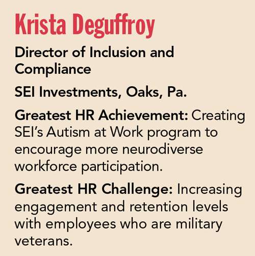 Stratton says Deguffroy is such an asset because she “regularly works toward discovering new potential” for SEI’s workplace and workforce. “By creating new programs and opportunities to promote employee growth and learning, Krista has significantly changed the pace for SEI’s workforce- development team,” Stratton says. “Her patience, empathy and knowledge make her a valuable asset to her team and the organization as a whole.”