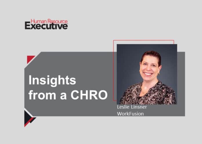 For Leslie Linsner, CHRO of WorkFusion, that conversation is nothing new: After all, she helms the people function for an organization that provides intelligent automation solutions for Fortune 500 companies. The firm’s AI-enabled “Digital Workers,” for instance, can help automate mundane job responsibilities—freeing up human employees for more gratifying work (boosting engagement and, in turn, retention), all while enhancing productivity, she says.