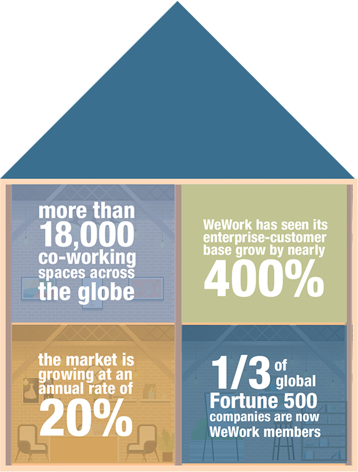 With more than 18,000 co-working spaces across the globe, the market is growing at an annual rate of 20%, according to Commercial Property Executive. WeWork, a national provider of co-working spaces with 674 locations in 117 cities across the world, has seen its enterprise-customer base grow by nearly 400% in the past year; one-third of global Fortune 500 companies are now WeWork members, the company said it its 2019 Global Impact Report.