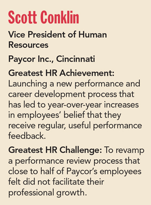 In response, Conklin assembled and led a “Tiger Team” at Paycor that was comprised of high-potential associates from all levels of the organization. The group reinvented the company’s performance-management process by moving away from annual reviews and creating the quarterly “Connect” process that focused on more frequent performance and career- development feedback and planning.