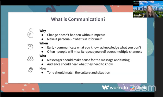 Transparency is key, she said. “That’s often counterintuitive for us as leaders because we might want to make sure we have everything stable and figured out first. Oftentimes in HR, we really like to have some degree of organization and stability, and yet at the same time, a lot of the times in disruption, our workforce actually needs to hear from us early. That means communicating what we know and what we’re confident in and what we don’t know and what we’re still figuring out.”