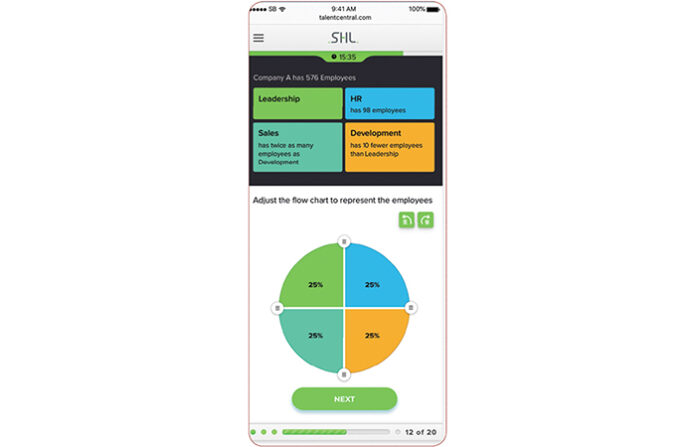 What It Is: SHL Verify Interactive is a cognitive-ability assessment suite designed for the small screen on mobile devices. The tests measure general mental ability, deductive reasoning (drawing conclusions from partial information) and inductive reasoning (drawing inferences from, and understanding relationships among, various concepts). Candidates work on real-world tasks, such as reading business-related statements and determining which of the listed options cannot be true or must be true, interpreting charts and graphs, and reconciling cash-register totals. It uses multi-point scoring (partial credit for responses), which reduces testing time. The tests include 30 items in 36 minutes and generate separate scores for each ability. While these tests can be administered on any platform, all parts of each question fit on a single mobile-phone screen, eliminating the need to scroll or remember information across multiple pages, eliminating the common disadvantage of mobile test-taking.